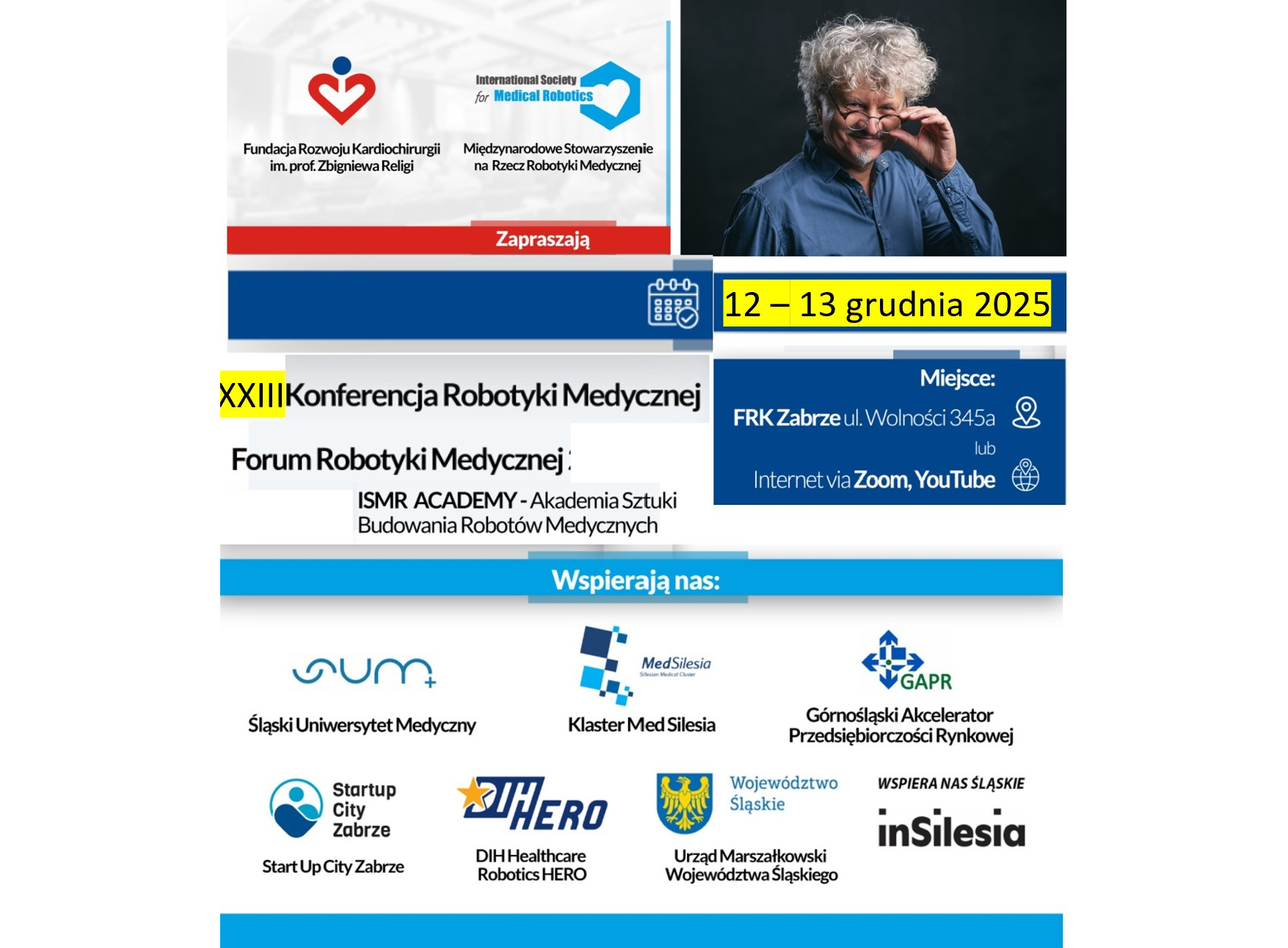 W dniu 12 grudnia Konferencja Roboty Medyczne oraz Forum Robotyki Medycznej odbędzie się w Fundacji Rozwoju Kardiochirurgii im. prof.Zbigniewa Religi w Zabrzu, ul . Wolności 345a, natomiast 13 grudnia spotkanie będzie miało miejsce w Muzeum Górnictwa Węglowego (Strefa Carnall ul. Wolności 408). Do spotkania będzie można również dołączyć online.